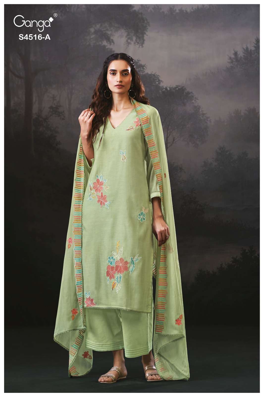 Crafted in premium pure fabric, the fabric offers a luxurious sheen, fluid drape, and an undeniably regal appeal. This ganga collection is known for its sophisticated colour palette and intricate weaving, making this suit a standout choice for festive dressing and elegant evenings.