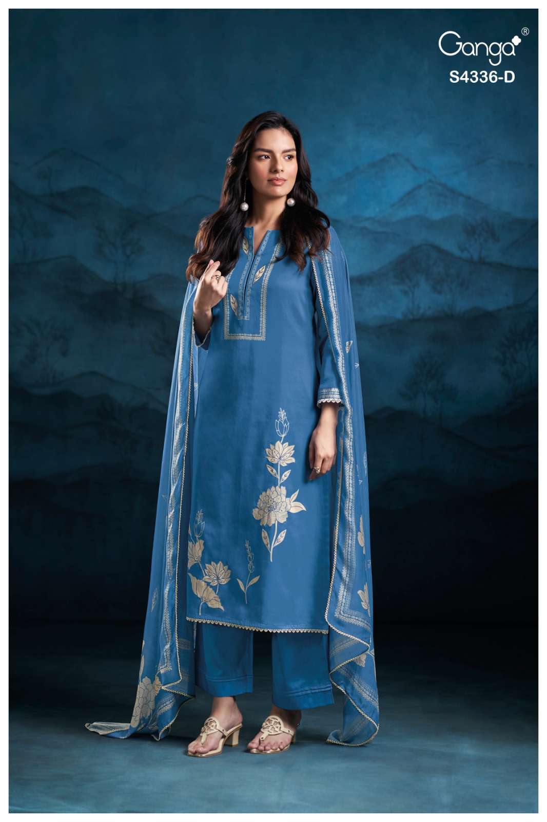 Crafted in premium pure fabric, the fabric offers a luxurious sheen, fluid drape, and an undeniably regal appeal. This ganga collection is known for its sophisticated colour palette and intricate weaving, making this suit a standout choice for festive dressing and elegant evenings.