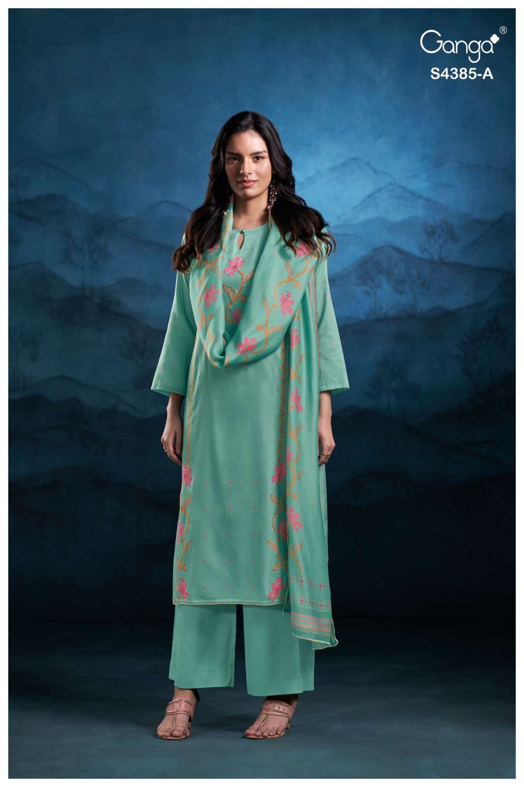 Crafted in premium pure fabric, the fabric offers a luxurious sheen, fluid drape, and an undeniably regal appeal. This ganga collection is known for its sophisticated colour palette and intricate weaving, making this suit a standout choice for festive dressing and elegant evenings.