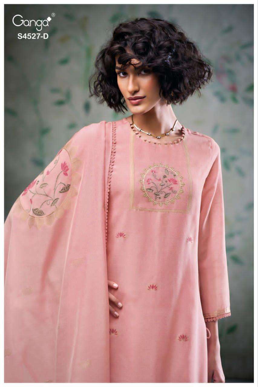 Crafted in premium pure fabric, the fabric offers a luxurious sheen, fluid drape, and an undeniably regal appeal. This ganga collection is known for its sophisticated colour palette and intricate weaving, making this suit a standout choice for festive dressing and elegant evenings.