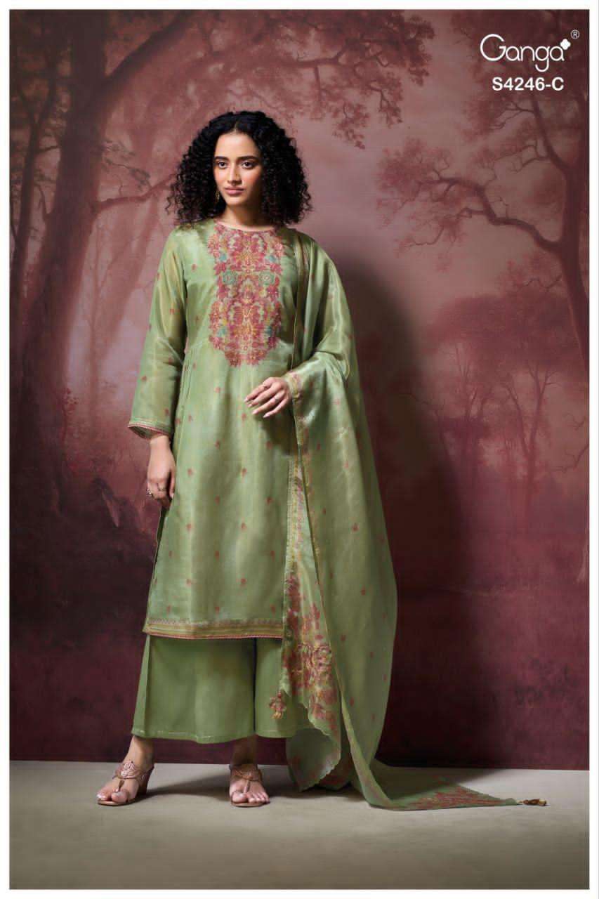 Crafted in premium pure fabric, the fabric offers a luxurious sheen, fluid drape, and an undeniably regal appeal. This ganga collection is known for its sophisticated colour palette and intricate weaving, making this suit a standout choice for festive dressing and elegant evenings.
