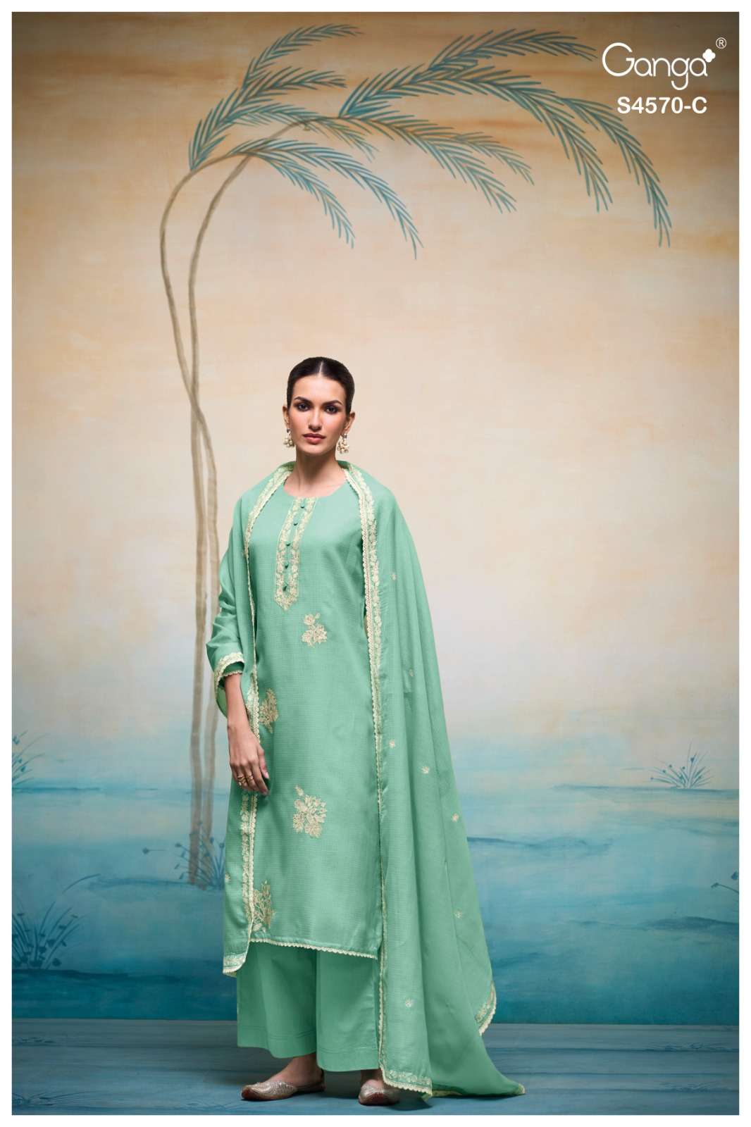 Crafted in premium pure fabric, the fabric offers a luxurious sheen, fluid drape, and an undeniably regal appeal. This ganga collection is known for its sophisticated colour palette and intricate weaving, making this suit a standout choice for festive dressing and elegant evenings.