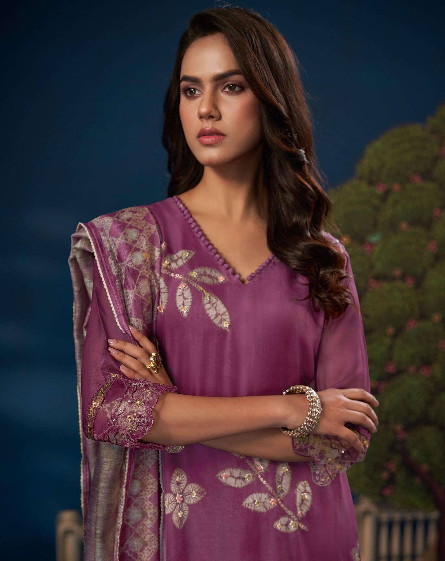 | Top: | pure burberry silk digital print with placement hand work and embroidery on daman and sleeves |