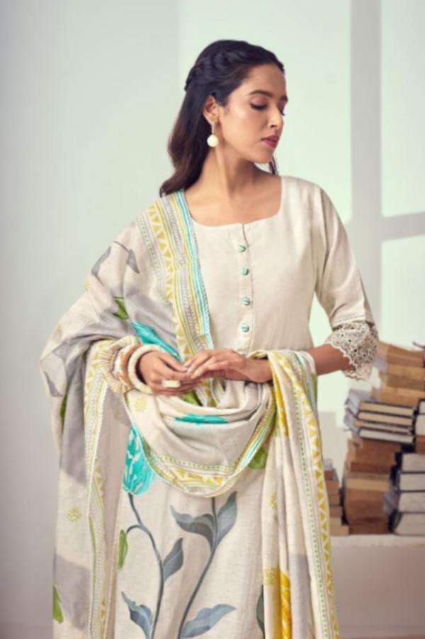 TOP: Pure Linen Jacquard With Fancy Embroidery And Lace Work BOTTOM: Pure Cotton Solid Colour With Embroidery And Lace DUPATTA: Pure Chanderi Lining Digital Print With Fancy Lace And Hangings