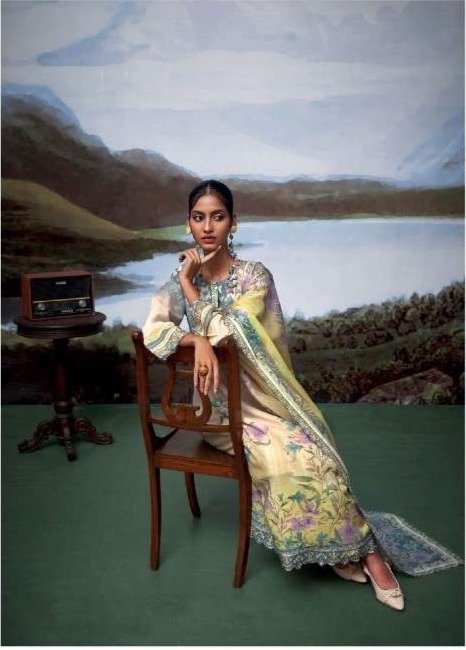 - Top: Pure lenin with digital print and scalloped embroidery organza border on hemline and sleeves, embroidery Placket