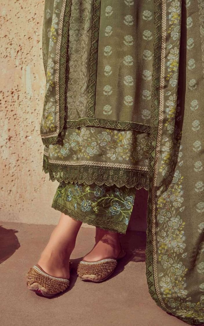 - Top: Pure muslin with digital print and organza scal- loped borders on panel, hemline and sleeves