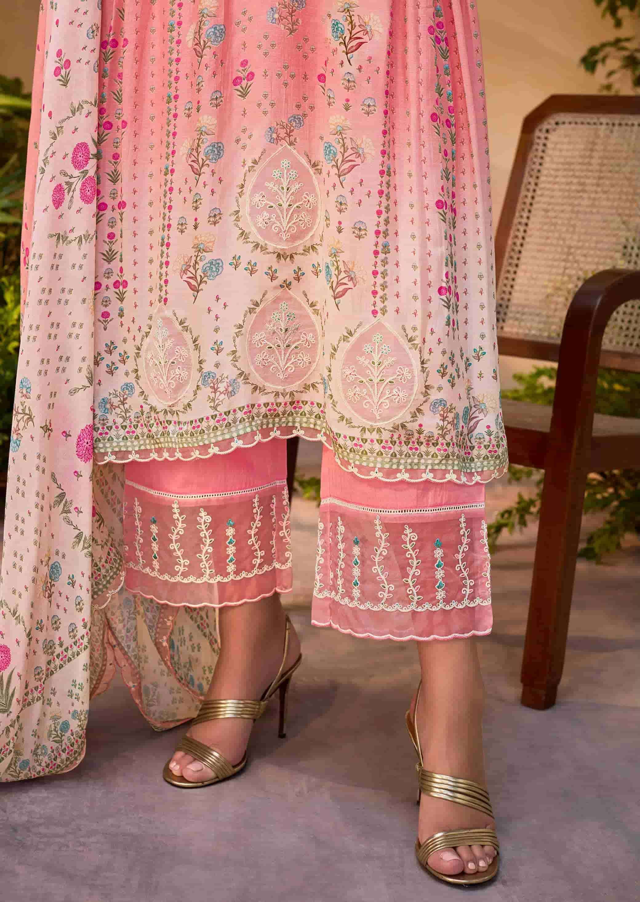 | Dupatta: | pure chinon with digital print and four side dori scalloped embroidery organza border |