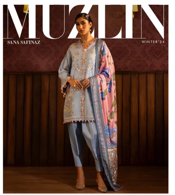 The Sana Safinaz Muzlin Unstitched Winter 2024 collection features a stunning array of designs that beautifully blend traditional aesthetics with modern sensibilities. This collection typically includes rich fabrics adorned with intricate embroidery, vibrant colors, and elegant patterns, perfect for the winter season.