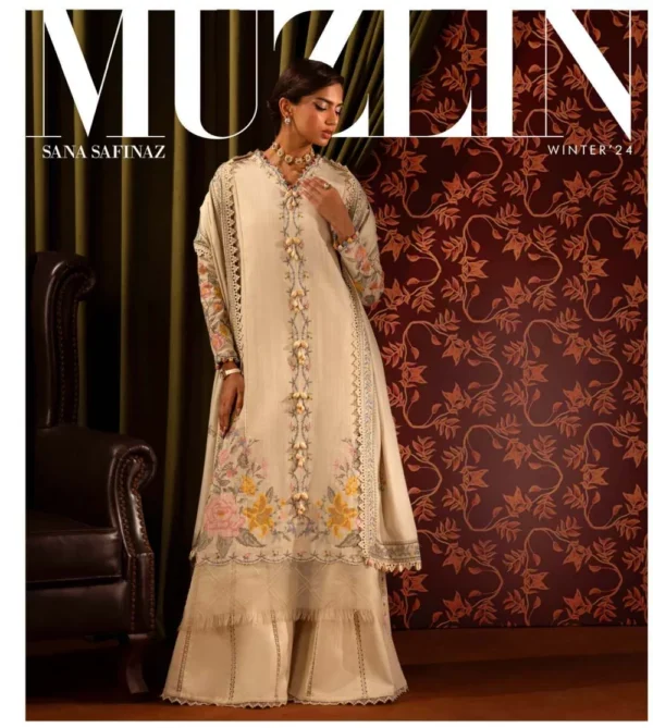The Sana Safinaz Muzlin Unstitched Winter 2024 collection features a stunning array of designs that beautifully blend traditional aesthetics with modern sensibilities. This collection typically includes rich fabrics adorned with intricate embroidery, vibrant colors, and elegant patterns, perfect for the winter season.