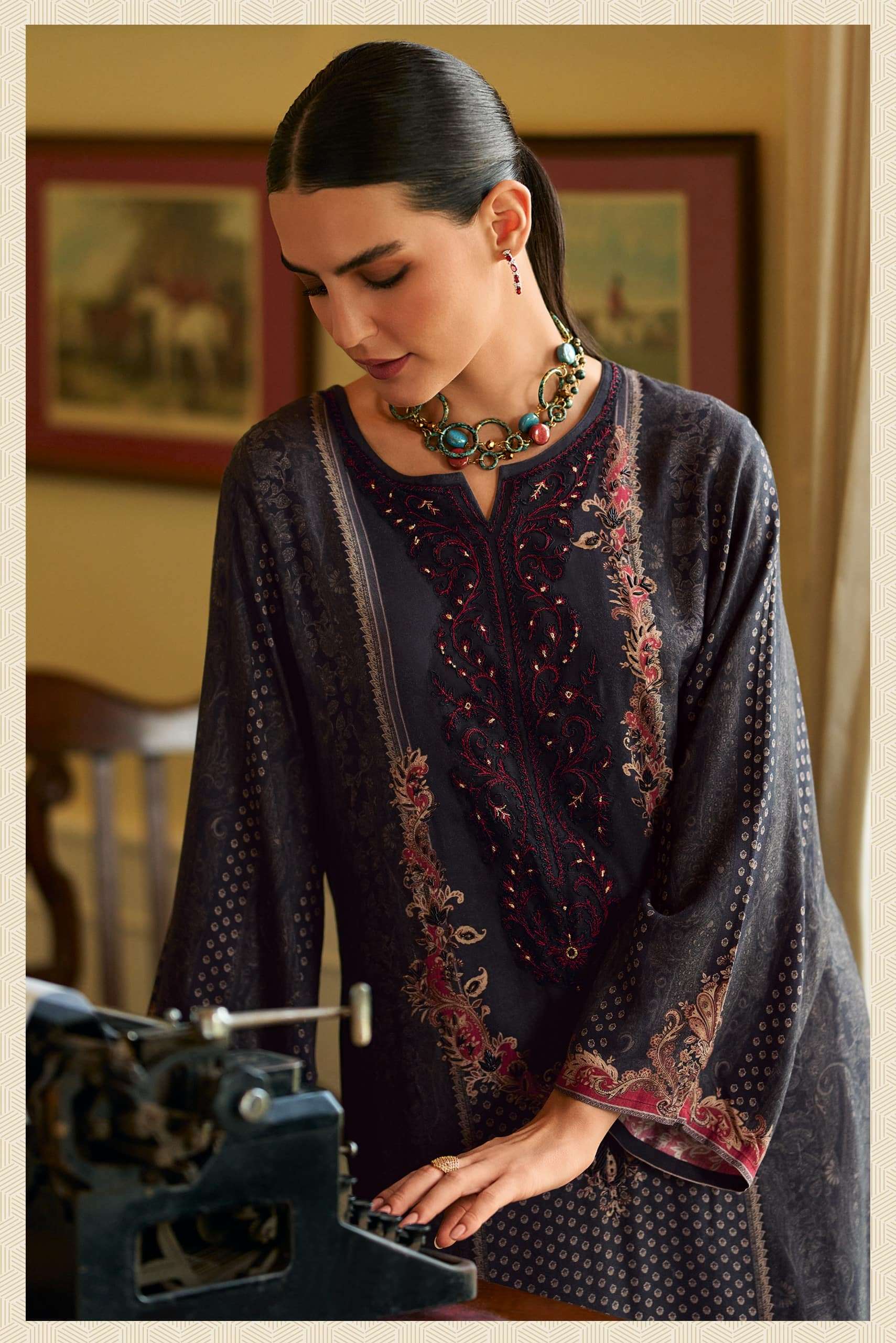| Top: | viscose muslin digitally printed with handwork and neck embroidery |