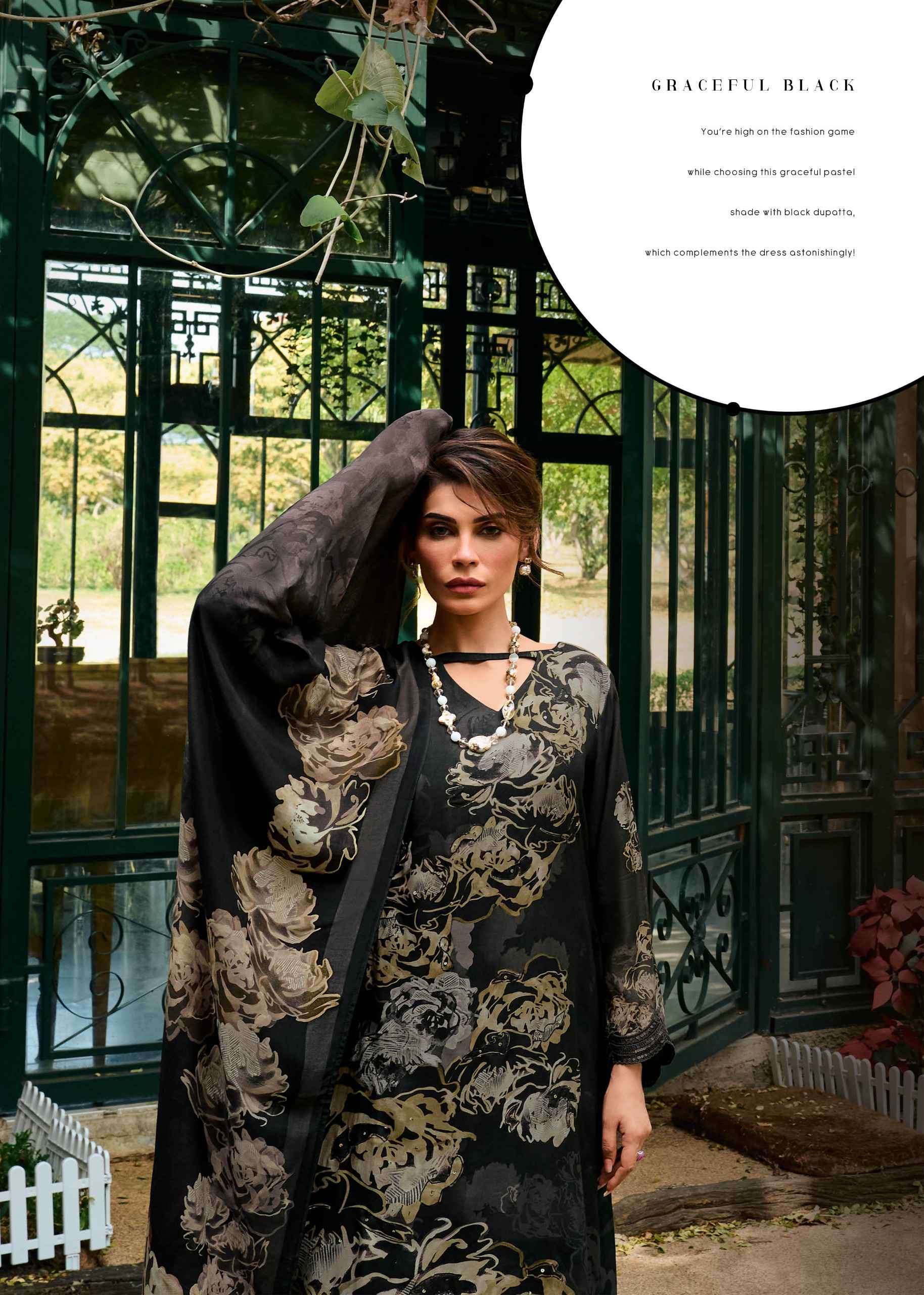 TOP: viscose muslin digitally printed with pitta work and laces BOTTOM: matte satin DUPATTA: viscose muslin digitally printed with added tassels