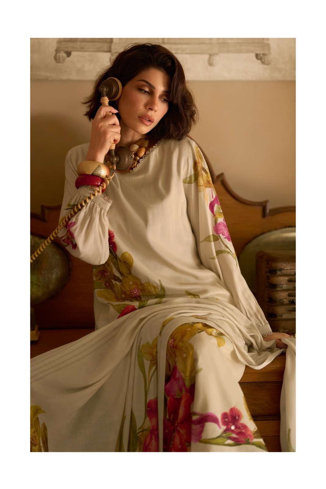 | Top: | viscose muslin digitally printed with thread and zari handwork and lace |